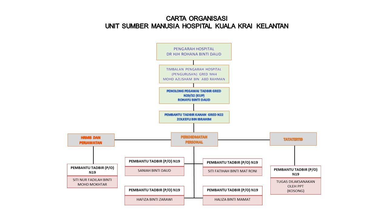 Unit Sumber Manusia merupakan salah satu cabang Bahagian Pengurusan Hospital yang bertanggungjawab menguruskan urusan perkhidmatan seseorang anggota mulai daripada lantikan pertama sehingga persaraan atau meninggalkan perkhidmatan awam. Unit ini beroperasi dengan jumlah anggota seperti berikut: